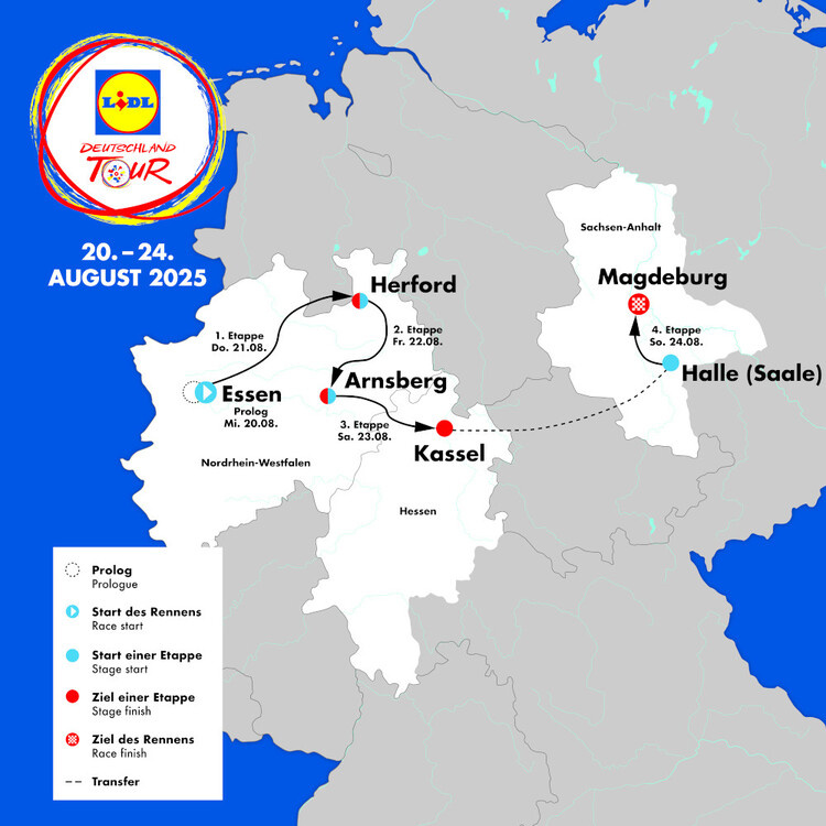 С 20 по 24 августа 2025 года в Германии пройдет Lidl Deutschland Tour — единственная многодневная велогонка в стране, входящая в календарь UCI ProSeries. В этом году маршрут пройдет через три федеральные земли: Северный Рейн-Вестфалию, Гессен и Саксонию-Анхальт, предложив зрелищные этапы для спринтеров, классиков и универсалов. Гонка начнется 20 августа с 3,1-километрового пролога в Эссене, который пройдет по территории бывшей угольной шахты Цольферайн — объекта Всемирного наследия ЮНЕСКО. Короткое раздельное стартовое испытание с техничными поворотами может сразу расставить первые акценты в генеральной классификации. Этап 1 (21 августа, Эссен – Херфорд, 202,6 км) — относительно плоский маршрут с небольшим финальным подъемом перед спринтом. Организаторы допускают, что ветер или тактика могут раздробить пелотон, но в целом день выглядит оптимальным для быстрых финишеров. Этап 2 (22 августа, Херфорд – Арнсберг, 190,3 км) — первый серьезный вызов для гонщиков. Маршрут проходит через Зигер
