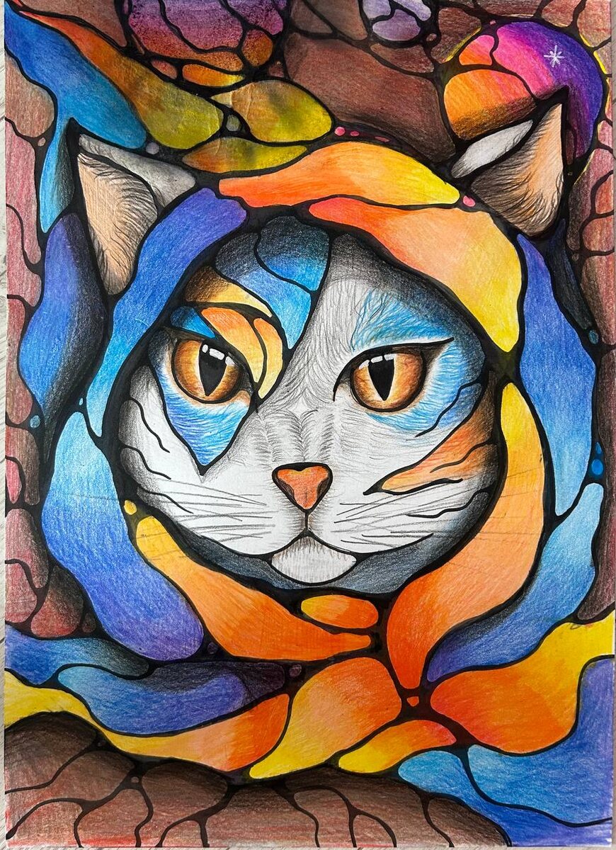 Конкурс #котокафе (присылайте рисунки до 25 августа в чат https://t.me/neurografica) Рисунок прислала Марина Романова: "Мой кот успел нашалить и пролить на себя масло. Прошлось отмыть насколько возможно. Поэтому он оказался завернутый в теплое полотенце и в моих объятиях 🧡💙🩶❤️"