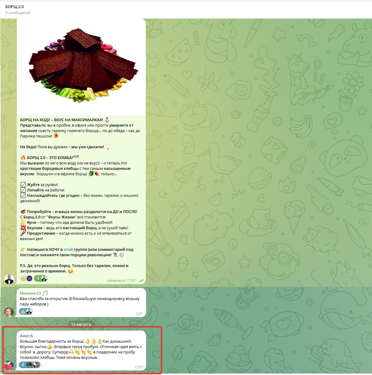 🍲 Борщ 2.0 — хит сезона, который покоряет сердца (и желудки)! 🔥 Привет food-экспертам и любителям вкусно поесть! 👋 🔸Готовы к гастрономической революции? ❤️🔥 Борщ 2.0 уже здесь, и это не просто борщ— это новый уровень вкуса! Что делает Борщ 2.0 особенным? ▫️ Идеальный баланс — больше вкуса, идеальная кислинка и нотка сладости от свеклы. ▫️ Авторский рецепт — секретные специи и технология приготовления, которая сохраняет все витамины. ▫️ Для ЗОЖников — можно брать с собой в командировки, путешествия и на пляж! Почему все в восторге? 💬 "Это не борщ, это взрыв вкуса! в новом формате Никогда не думала, что моё любимое блюдо может быть таким ." "Заказал на пробу — теперь семья требует только Борщ 2.0. Спасибо за находку!" Где попробовать? 🚀 Исключительно только у нас! Успейте оценить первыми! Просто напишите в группе. 100 гр. нашего борща это две большие тарелки обычной версии. 📌 Пиши в комментах — ты уже пробовал Борщ 2.0? Как тебе? 👇