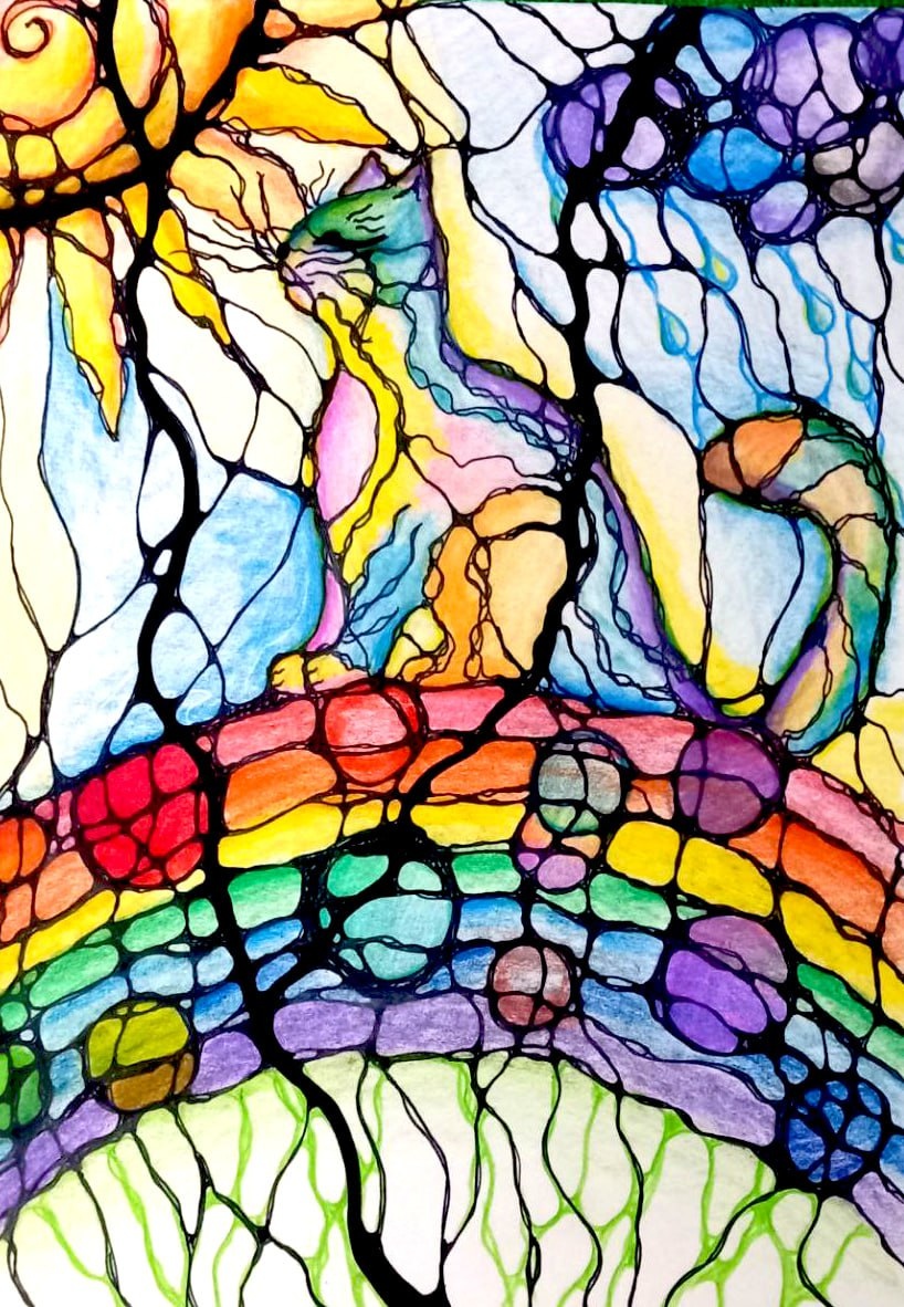 Конкурс #котокафе (присылайте рисунки до 25 августа в чат https://t.me/neurografica) Рисунок прислала Елена: "Сегодня моя Кошка Благодарности пошла гулять по радуге, любоваться звездой по имени Солнце, и разгонять... превращать просто тучи - в тучи Волшебства! 💫💫💫"