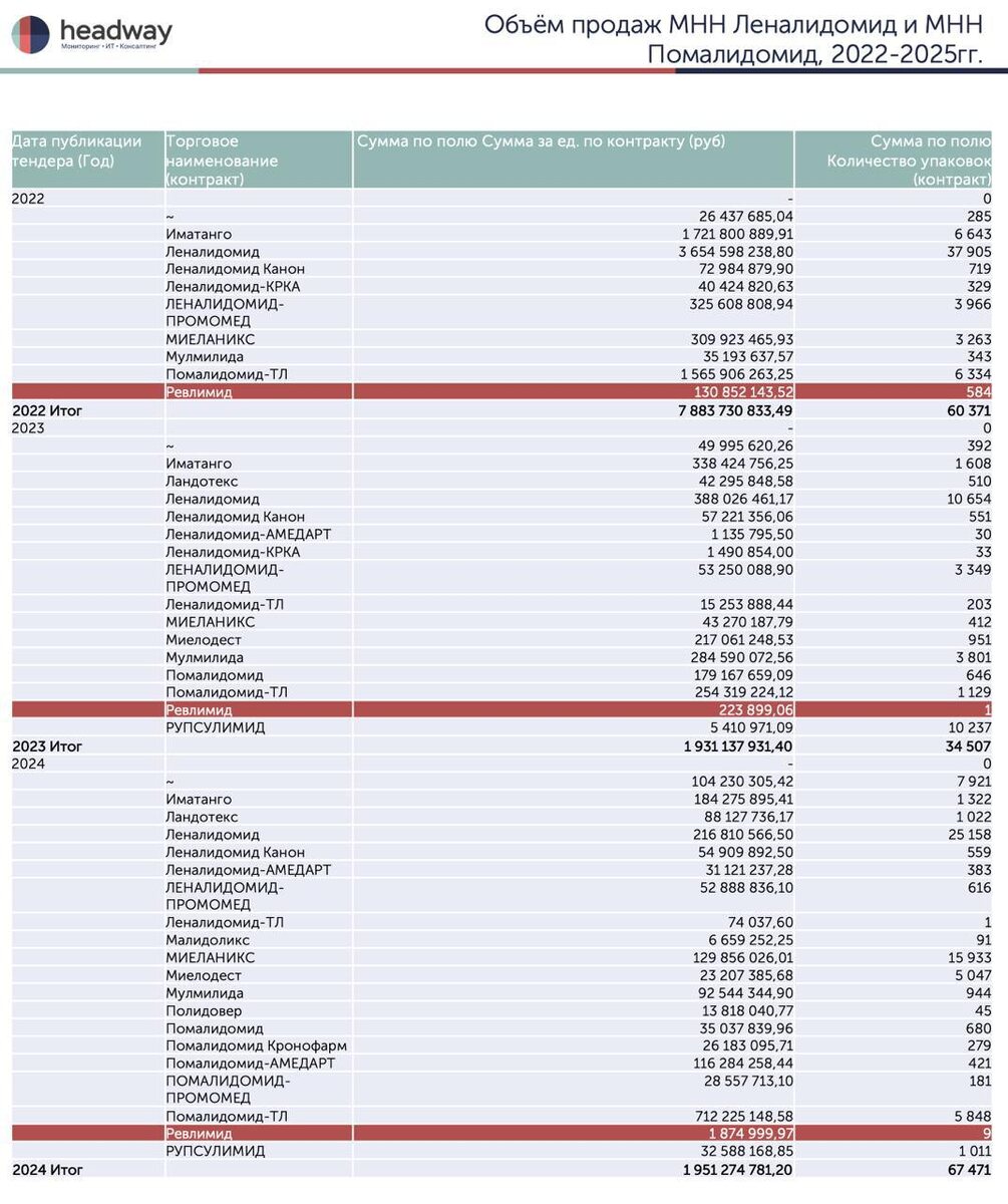 Онкология без импорта: как российские лекарства вытеснили американские В России отозвана регистрация противоопухолевых препаратов для лечения рака крови «Ревлимид» и «Имновид», принадлежащих американской компании Bristol-Myers Squibb, ушедшей с рынка в 2022 году. Их место заняли российские дженерики, которые стоят в 2–2,5 раза дешевле. За 2024 год в рамках госзакупок было приобретено более 52 тысяч упаковок аналогов на основе леналидомида и свыше 14 тысяч упаковок с помалидомидом. Производство части оригинальных препаратов ранее локализовали на российских площадках. Таким образом, рынок терапии рака крови в стране фактически полностью перешёл под контроль отечественных производителей. Последняя закупка ТН «Ревлимид» произошла в январе 2024г. на сумму 1,8млн руб. ТН «Имновид» последний раз закупался летом 2021г. на сумму 2,1млн руб. Подписывайтесь на наш ТГ-канал