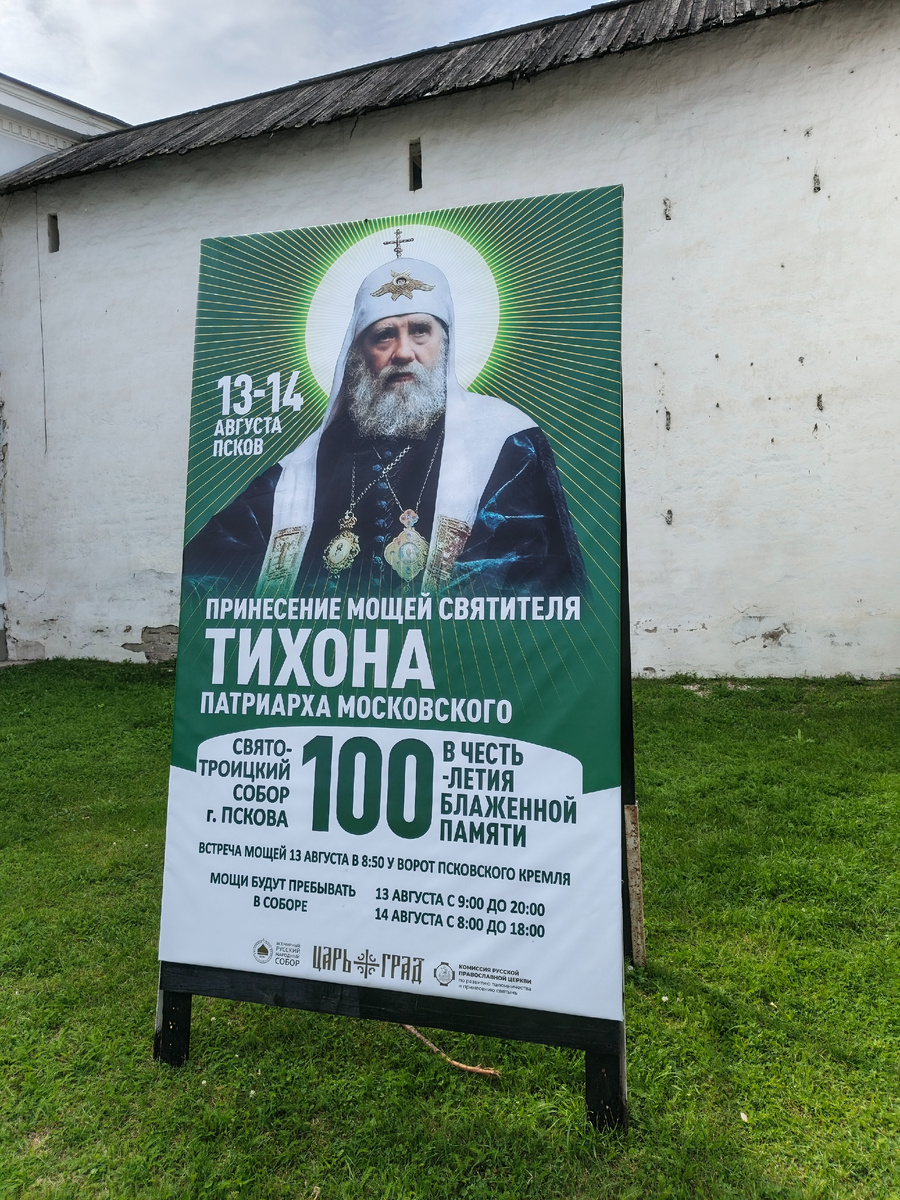 В последний наш псковский день с утра мы побывали в Троицком соборе Кремля, приложились к мощам святителя Тихона, патриарха Московского. Патриарх Тихон (в миру Василий Иванович Белавин) родился в Псковской области в семье священника. Окончил Псковскую духовную семинарию, потом духовную Академию в Петербурге. После преподавал 3,5 года в Псковской семинарии догматику, нравственное богословие и французский язык. В 1891 году принял постриг с именем Тихона, служил архиепископом в разных епархиях. Как миссионер с риском для жизни проповедовал индейцам-алеутам. За 78 дней объехал всю Аляску, а это 11 тысяч километров! В 1917 году был возведён в сан митрополита. Не называя прямо большевиков, он огласил анафему тем, кто организовывал гонения на церковь. Патриарх Тихон не побоялся открыто осудить расстрел царской семьи, считал его позором и беззаконием. Лично симпатизируя Деникину и Колчаку, не благословил Белое движение. Думаю, не поддерживал братоубийственные войны. Видя, как плохо живётся