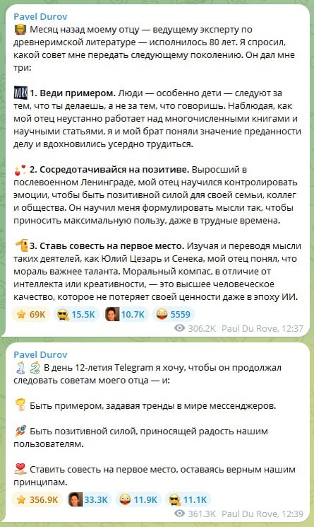 Павел Дуров опубликовал праздничные посты, поделившись советами своего отца, которому месяц назад исполнилось 80 лет: 1. Быть примером и следовать за лучшими. 2. Сосредоточиться на позитиве и контролировать эмоции. 3. Ставить совесть на первое место и оставаться верным принципам. CtrlAltDelights- подписаться