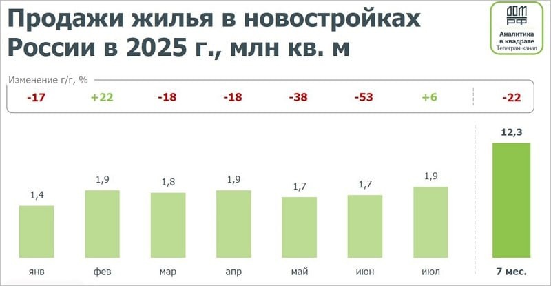 За январь–июль застройщики реализовали 12,3 млн м² жилья на 2,5 трлн руб., что на 22% меньше по площади и на 13% по сумме, чем годом ранее.