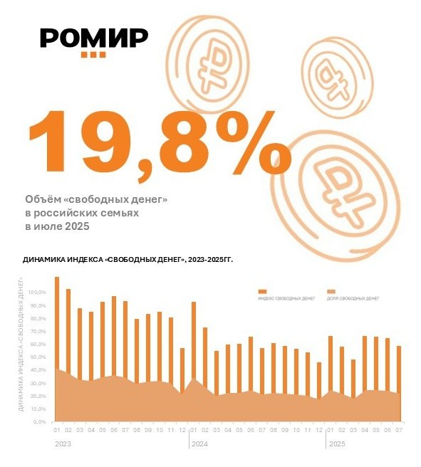 В ответ на пост 19,8% составила доля «свободных денег» в бюджете среднестатистической российской семьи в июле 2025 года, что на 2.1 п.п. ниже, чем в июне. Индекс свободных денег (ИСД) достиг значения 58,7%, уменьшавшись на 6.8 п.п. по сравнению с предыдущим месяцем. Относительно мая прошлого года ИСД вырос на 1.6 п.п. 🔸 На начало и середину лета приходится основной объем трат россиян на путешествия, поездки и отдых. Значительные расходы на билеты, проживание, развлечения, а также дополнительные покупки во время отпусков приводят к существенному использованию накоплений и сокращению располагаемого дохода к концу летнего сезона. 🔸Часть средств также может быть направлена на подготовку к новому учебному году, хотя основные траты на эти цели придутся на август. #индекссвободныхденег @m_romir