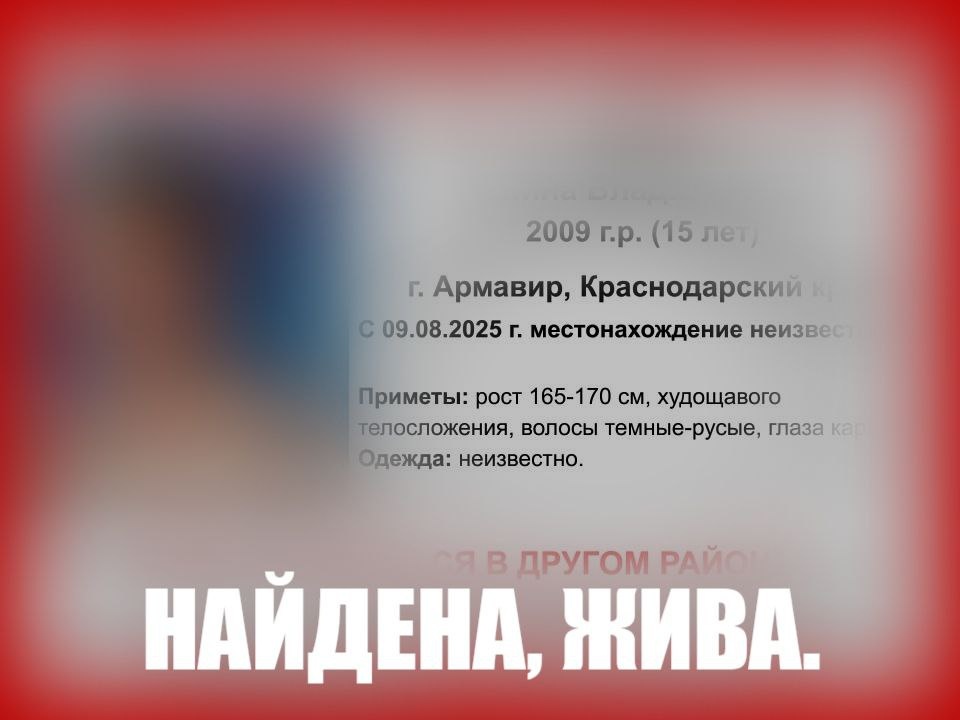 UPD: найдена, жива. Внимание! Пропал подросток! #Майер Полина Владимировна, 2009 г.р., (15 лет) г. #Армавир, Краснодарский край. С 09.08.2025 г. местонахождение неизвестно. Инфорг поиска: Юлия 89528724228 Всех, кто обладает информацией о пропавшем, просим сообщить по телефону бесплатной горячей линии 88005501054 или 112. Если вы готовы помогать в поиске пропавших без вести, приглашаем присоединиться к телеграм-чату оповещения: t.me/poisk_193