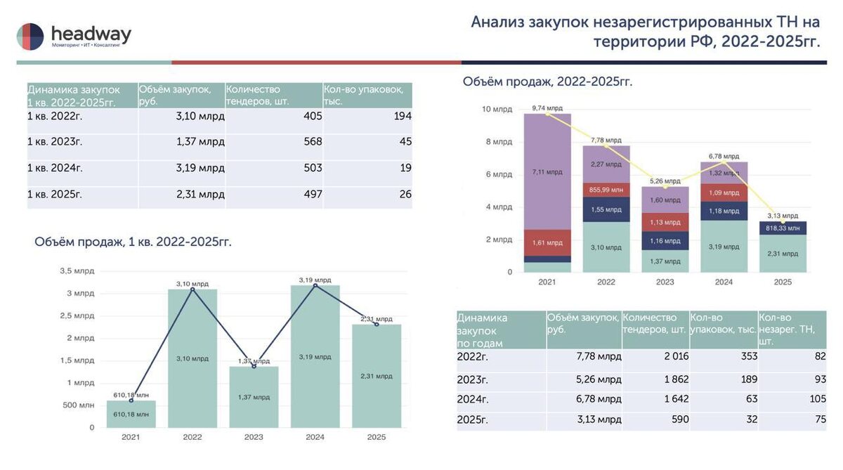 В рамках этой новости мы подготовили краткий анализ госзакупок незарегистрированных торговых наименований (ТН) за период с 2022-2025гг.