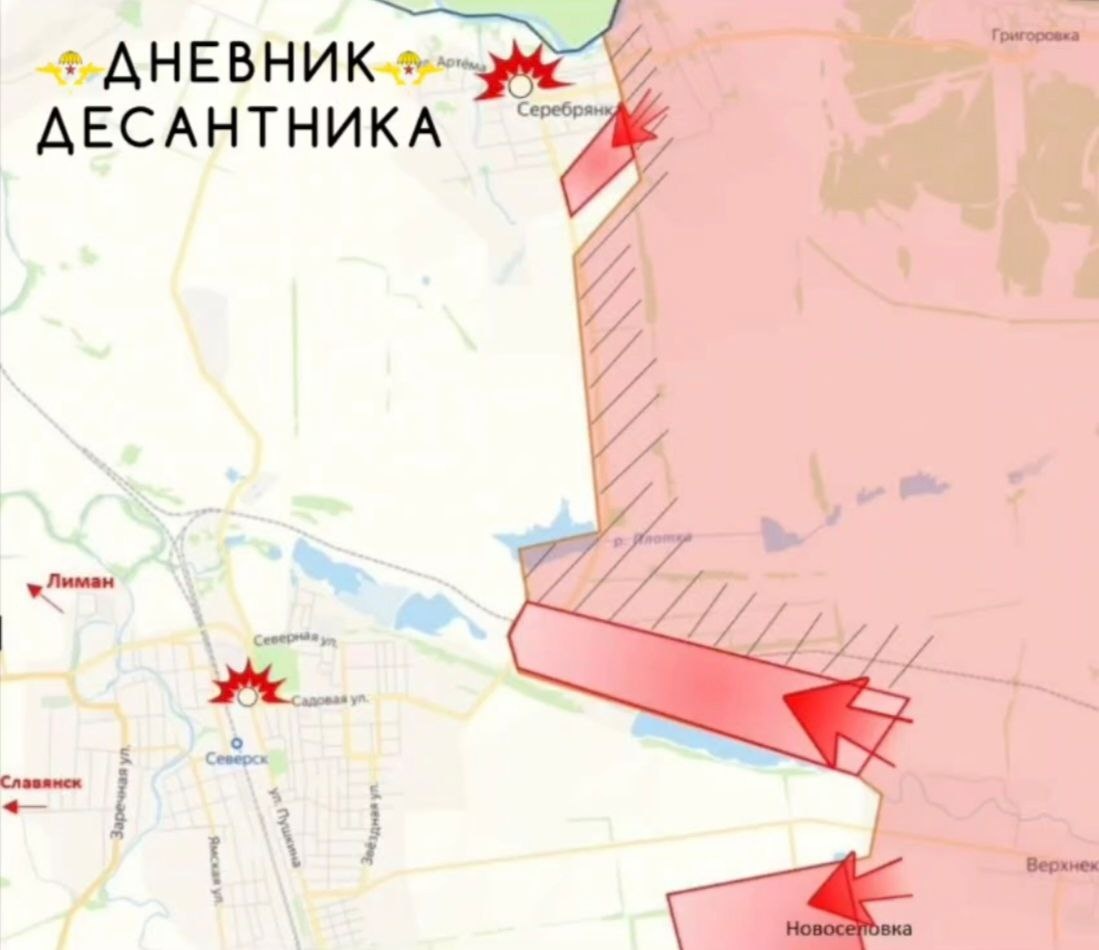 🪂 Северское направление На данном направлении есть продвижения ВС РФ сразу по нескольким населенным пунктам ДНР. В н.п. Новоселовка наши войска с юго-запада имеют продвижение порядка 900 метров. Заходим вглубь н.п. Серебрянка со стороны северной его части. Район н.п. Северск Движемся с запада вдоль реки и пруда к центру населенного пункта. В восточной части самого Северска противник имеет ряд оборонительных рубежей, которые преграждают заход в Северск с этой стороны. Наносим удары сбросами, обрабатываем артой данные укрепы противника, работает авиация. Нашими расчетами БПЛА сорвана ротация ВСУ: операторы ВС РФ выявили и ликвидировали группу ВСУ, вражеской ББМ MaxxPro и пикап. Также вскрыто и уничтожено на данном направлении: 💥3 пункта БпЛА; 💥одно артиллерийское орудие Д-30. ▫️ Дневник Десантника