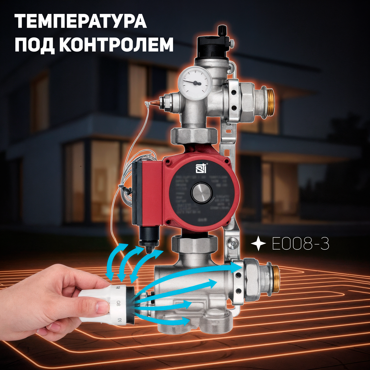 Узел E008-3 (с термостатической головкой, без насоса). Данная модель представляет собой классический смесительный модуль с термостатическим клапаном, управляемым выносной термоголовой. В конструкции два литых латунных корпуса, соединённых кронштейном: в нижнем корпусе происходит смешивание горячей воды из котла с охлаждённой водой обратки пола, а верхний корпус подаёт уже смешанный теплоноситель в коллектор подачи пола. Регулировка температуры осуществляется термостатической головкой с выносным датчиком: датчик помещается в гильзу на выходе из узла и контролирует температуру, влияя на открытие клапана. На передней части узла установлен удобный контактный термометр, по которому монтажник или пользователь сразу видит текущую температуру подачи. Встроенный автоматический воздухоотводчик в верхней точке удаляет скопившийся воздух без вмешательства человека. Для защиты насоса и поддержания минимальной циркуляции предусмотрен байпас – в нижнем корпусе узла имеется перепускной клапан с регулируемой настройкой (шкала от 0 до 5) рядом с термоголовкой. Монтажник может отрегулировать байпас под характеристики системы, чтобы при закрытии термостатического клапана или отдельных контуров пола часть потока шла через байпас, предотвращая останов насоса. Узел E008-3 не комплектуется насосом, что даёт свободу выбора любого циркуляционного насоса стандартного размера (подключение G1" с межосевым 130 мм). Корпус изготовлен из прочной латуни, устойчивой к коррозии при использовании воды или водногликолевой смеси в качестве теплоносителя. Производительность узла рассчитана до ~4,8 м³/ч, чего достаточно для средних по площади систем тёплого пола. Производитель (STI) предоставляет гарантию 1 год на изделие.