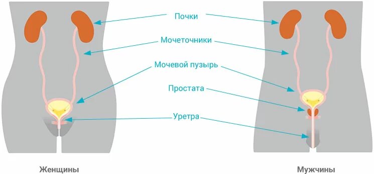Органы мочевыделительной системы идентичны у мужчин и женщин: 2 почки, 2 мочеточника, мочевой пузырь и мочеиспускательный канал (уретра).