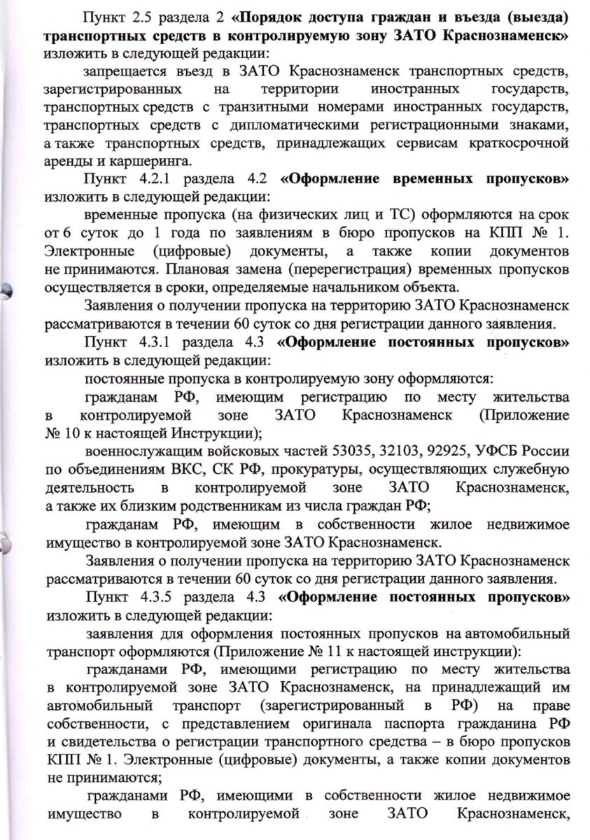 К инструкции по организации пропускного режима в контролируемой зоне ЗАТО Краснознаменск Московской области появились дополнения касающиеся