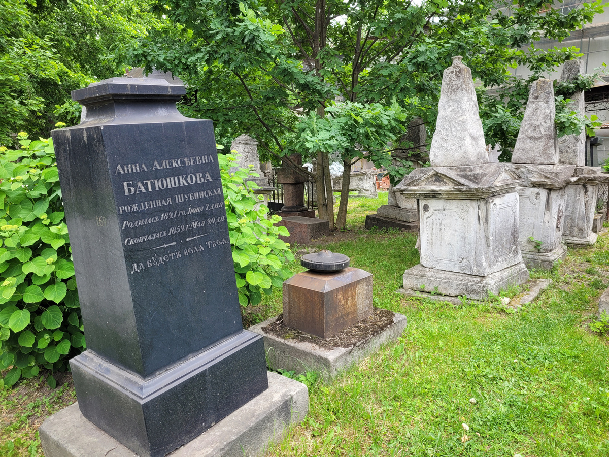 Слева направо памятники: А.А. Батюшковой, Ю.Н. Батюшковой, протодиакона Василия Гавриловича, священника Александра Михайловича и придворного священника Михаила Алексеевича Анна Алексеевна Батюшкова (1821-1852) - помещица Ярославской губернии Надпись: