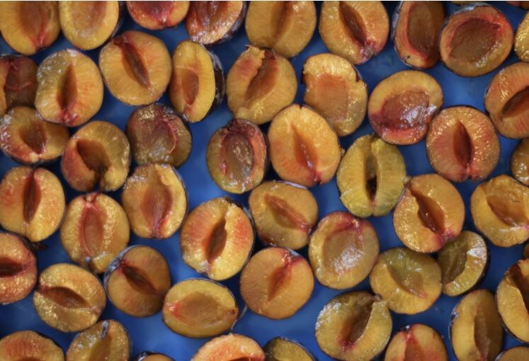 - Разогрейте духовку до 50°C, поставьте противень со сливами.