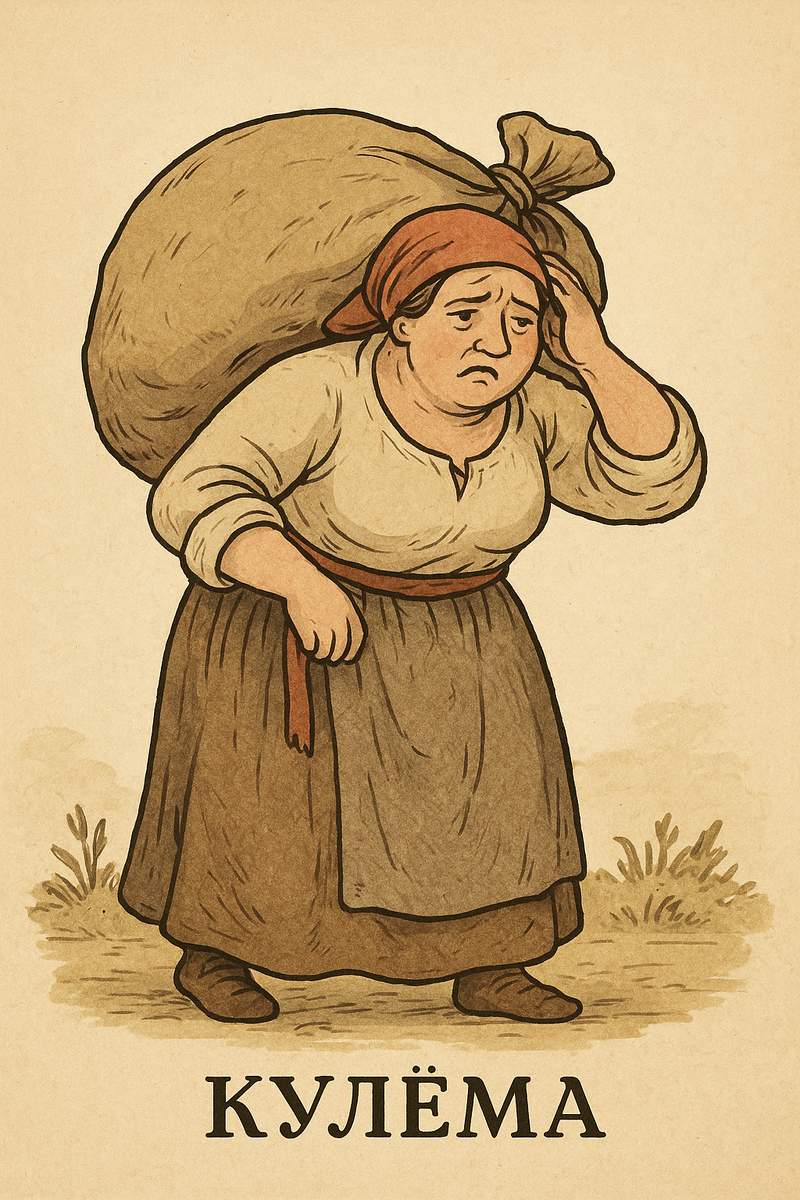 В старину «куль» — это вовсе не метафора, а самый настоящий мешок. Сначала его шили из овчины или других шкур — для зерна, муки, да и для всего, что в хозяйстве надо было перетащить. Потом пошли ткани попроще: рогожа, холст, мешковина. А вот «кулёма» — это та же тара, но в женском роде. И тут началось самое интересное: слово плавно перекочевало в разряд оценочных. Так стали называть девушек и женщин, которые выглядели… ну, скажем так, слегка помято и неровно: тут подол завернулся, там рукав сполз, и вся композиция напоминала мешок, в который кое-как что-то набросали. Но «кулёма» — это не про красоту или её отсутствие, а про общее впечатление: неуклюжая, медлительная, одежда сидит как хочет. И да, обидно быть «кулёмой»? Возможно. Но зато уютно — мешки ведь всегда что-то полезное в себе несут.