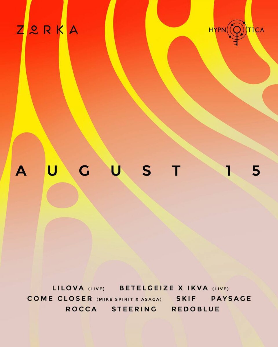 Мы подобрали отличную комбинацию, оправдывающую веселье и гедонизм — 15 августа встречаемся под открытым небом на любимой террасе Zorka, чтобы прочувствовать летний вайб и насладиться новыми музыкальными шедеврами. Приглашаем всех вас на импровизированный курс танцевальных медитаций и теплового обмена позитивной энергией! Line-up: Lilova (live) Betelgeize x IKVA (live) Come Closer (Mike Spirit x Asaga) Skif Rocca Paysage Steering Redoblue 🎫 Купить билет | Списки 📆 15 августа, в 22:00. 📍Зорька терраса и бар, Москва, ул. Косыгина, 28с1