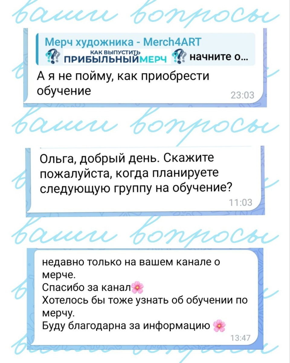 Дорогие художники Спасибо вам огромное за такой интерес к обучению 💙💙💙 Следующая группа запланирована на конец сентября. Но, в связи с тем, что от вас каждый день приходят запросы, 26 августа делаем дополнительную группу Все подробности программы и способов оплат у Натальи @merch4_art Пишите ей в личные сообщения И ещё, хочу напомнить, что работы выпускников можно посмотреть в отдельном канале @student_merch 💙💙💙
