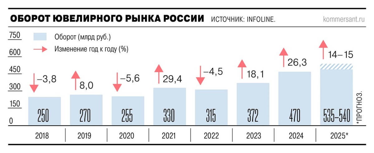 Infoline: в 2025 году продажи ювелирных изделий в России стали снижаться. По подсчетам сервиса «Чек Индекс», в январе—июне число покупок ювелирных изделий сократилось на 5% год к году, однако средний чек вырос на 7%, до 9,2 тыс. руб. Это связано с более высокой базой минувшего года: на фоне общего снижения потребления происходит и замедление продаж в целом по категории ювелирных изделий и бижутерии, что особенно заметно в офлайн-торговле, поясняют в компании. По оценкам Infoline, в первом полугодии объем ювелирного рынка вырос на 12% год к году, до 232 млрд руб. По прогнозам компании, во второй половине года темпы роста рынка ускорятся, и по итогам года показатель вырастет более чем на 14%, до 535–540 млрд руб. с НДС. Подпишитесь на «Ювелир и закон» в Telegram | ВКонтакте | MAX | Дзен | Сетка