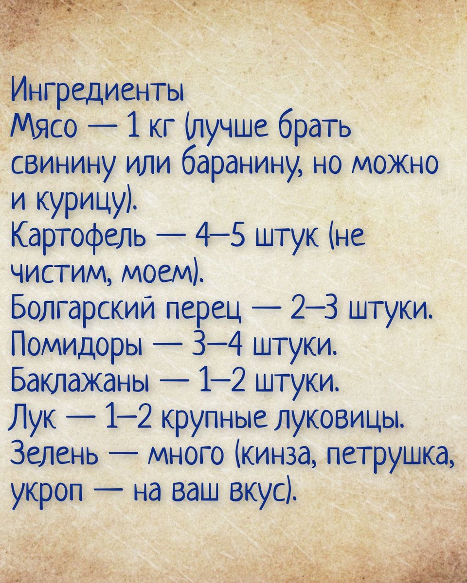Мясо — 1 кг (лучше брать свинину или баранину, но можно и курицу).