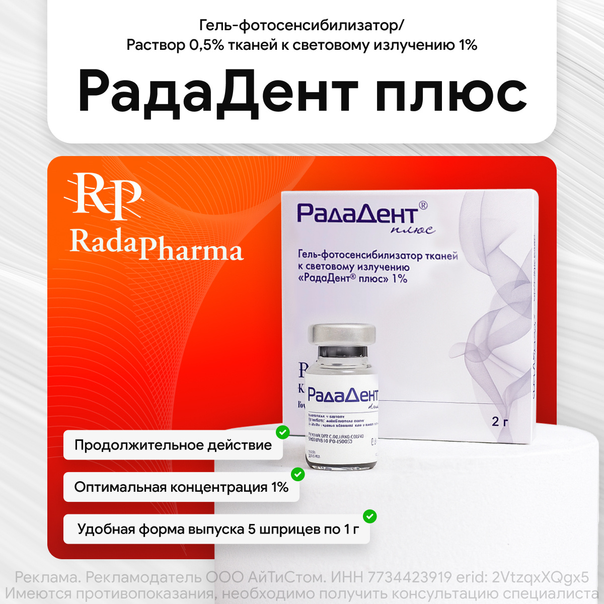 РадаДент плюс — это антисептический гель с 1% хлоргексидина биглюконата, предназначенный для местного применения в стоматологической практике. Препарат используется в периодонтии, имплантологии, хирургии и других направлениях для санации пародонтальных карманов, обработки каналов и профилактики воспалительных процессов.
