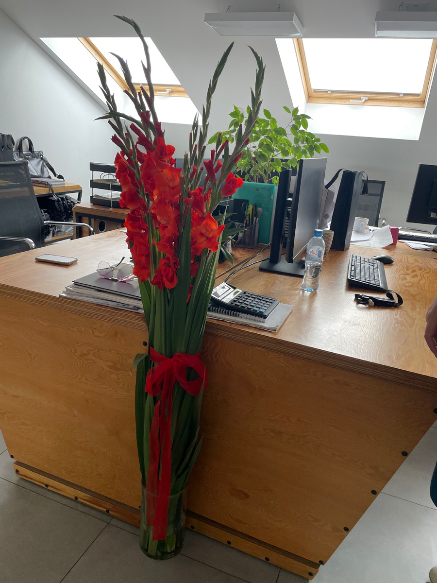 Роскошные гладиолусы для коллеги. Съедобный подарок от турка. Новая стрижка.
