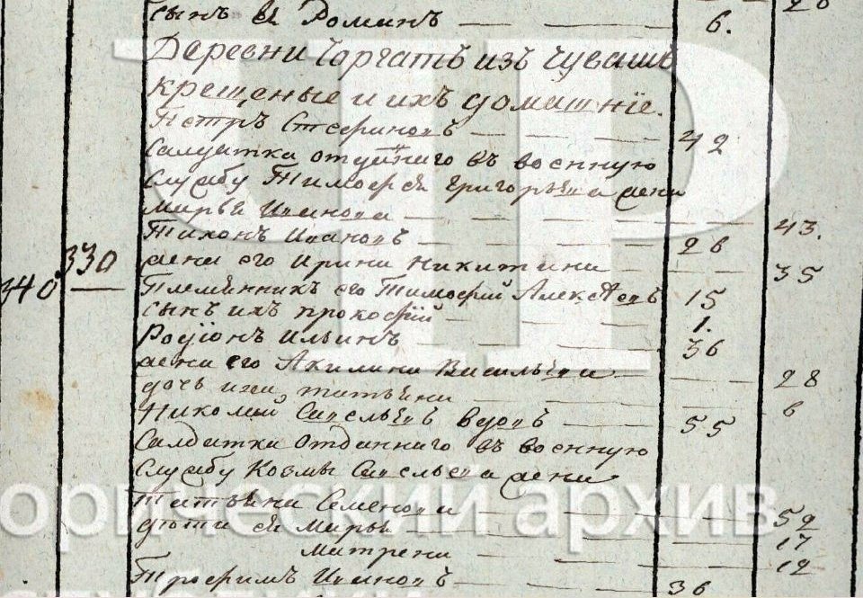 Государственный исторический архив Чувашской Республики. Фонд № 225, Опись № 7, дело № 44. Стр. 2999 скан. Ведомость Казанской епархии и губернии ведомства Чебоксарского духовного Правления Цывильского уезда села Шигалей Воскресенской церкви части священника Дмитрия Инфантова с причтом обретающимся при оной церкви в приходе нижеявленных чинов людям, со изъявлением против коегождо имени о бытии их в Святую Четырёхдесятницу у Исповеди и Святых Таин причастия, и ктож исповедывался токмо, а не причастился, и ктож не исповедывался. Стр. 3067 скан. Деревни Чоргат из чуваш крещёные и их домашние. Пётр Стефанов. 42 лет. Солдатка отданного в военную службу Тимофея Григорьева жена Марья Иванова. 43 лет. Тихон Иванов. 26. Жена его Ирина Никитина. 35. Племянник его Тимофей Алексеев. 15. Сын их Прокофий. 1. Родион Ильин. 36. Жена его Акилина Васильева. 28. Дочь их Татьяна. 6. Николай Савельев вдов. 55. Солдатка отданного в военную службу Козмы Савельева жена Татьяна Семёнова. 52. Дети ея Марья. 17.
