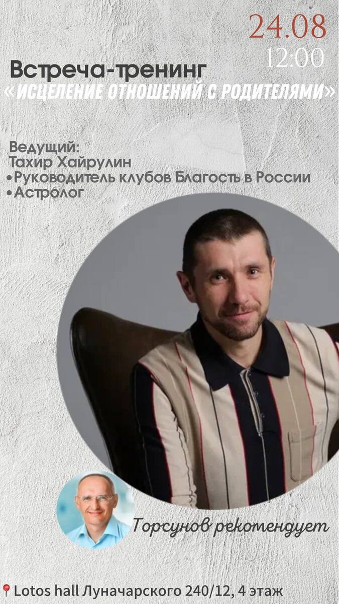 ЕКАТЕРИНБУРГ 24.08 Доброго времени суток, друзья 🩶 🤲🏼Спешим пригласить вас на крутую встречу-тренинг «Исцеление отношений с родителями» ☝🏽В настоящее время актуальность построения гармоничных и наполняющих отношений с родителями возрастает, ведь это дает: •силы жить •увеличивает твой личностный потенциал •возможность встретить хорошего супруга/супругу •наладить финансовую часть жизни •продвигаться в социуме •углубить отношения с детьми И многое другое 👩🏼🍼Родители-это наша благословляющая сила 🗣Кто проводит? Тахир Хайруллин Руководитель клубов «Благость» в России Астролог После встречи трансформации в твоей жизни неизбежны🔥 📍Где?Екатеринбург, Lotos hall Луначарского 240/12, 4 этаж 🕐Когда? 24.08, начало в 12:00 📖Регистрация и запись:89049895409 Александра Встреча проходит за пожертвование (рекомендованное от 1000р)🙏🏼 🤩Так же есть возможность попасть на личную астро-консультацию к ведущему ✊🏼Что дает консультация: •видение картины жизни в целом •предвосхищение