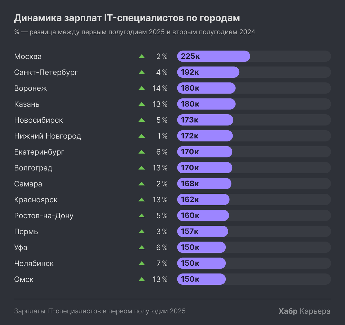 - IT-специалистам в регионах сейчас платят в среднем 160 000 ₽, в Москве средняя зарплата – 225 000 ₽, а в Санкт-Петербурге – 192 000 ₽.