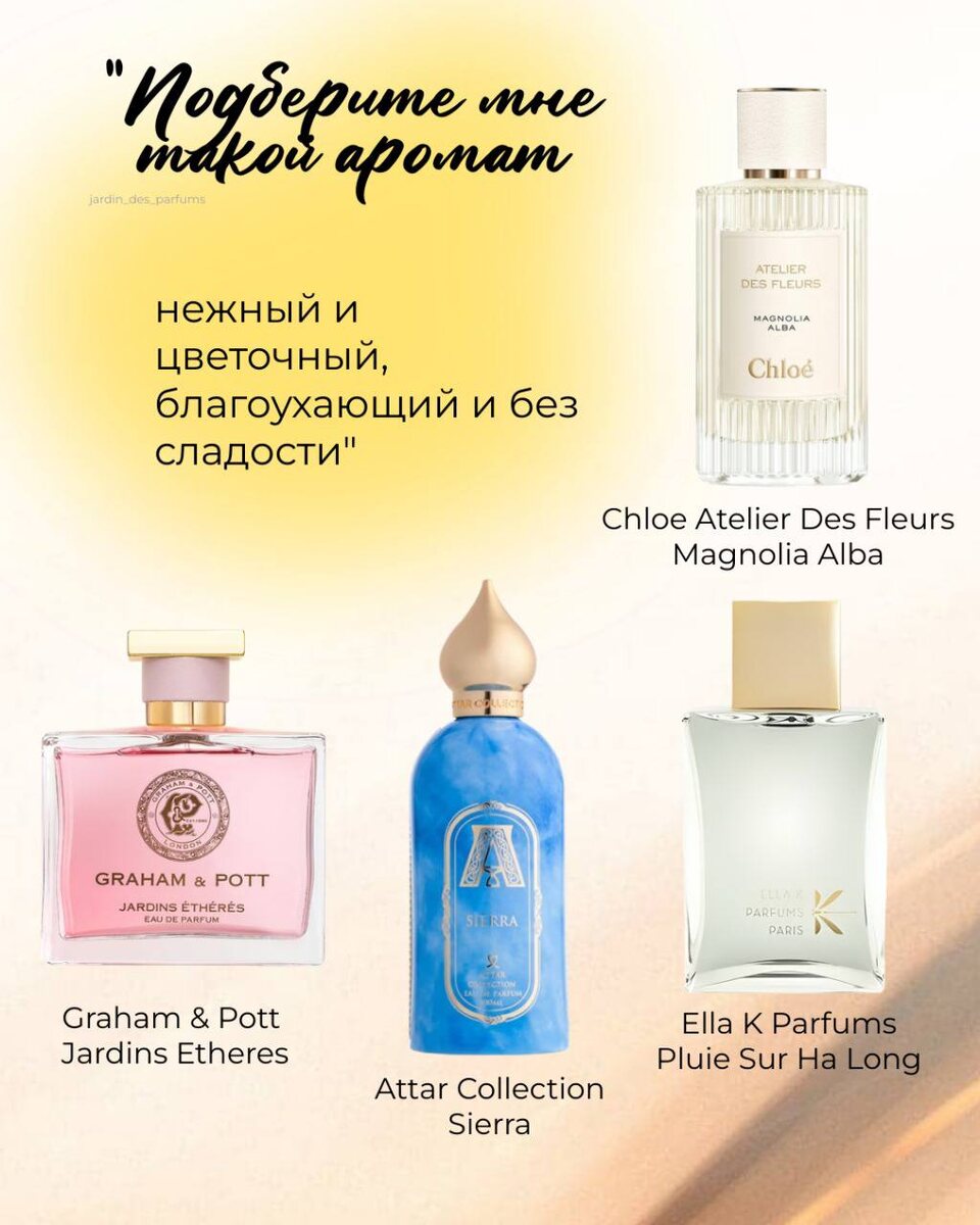 5 готовых подборок ароматов, сохраняйте как списки для затестов, чтобы приходя в парфюмерный магазин у вас названия сразу были под рукой. Я ответила на одни из самых частых запросов, которые получаю ежедневно на консультациях. Если у вас еще есть идеи, которые нужно раскрыть в подобной рубрике, пишите, сделаю и по вашей теме такую подборку. Сформулировала я данные запросы в формате сборной солянки, т е канва темы полностью отражает околотематические ароматные ассоциации. "Мне нужен цветочный аромат, только несладкий, нежный, женственный" Graham & Pott Jardins Etheres Chloe Atelier Des Fleurs Magnolia Alba Attar Collection Sierra Ella K Parfums Pluie Sur Ha Long "Я ищу сладко-свежий парфюм, сильно сладкие не люблю, но фруктам буду рада." Les Soeurs De Noe Pear Addiction Creed Acqua Fiorentina Arcadia London State of Mind Butterfly Mind "На мне мало какие ароматы держатся долго, от того и шлейфа нет, мне нужен мега шлейфовый аромат" Parfums BDK Impadia Parfums de Marly Valaya Exclusif M