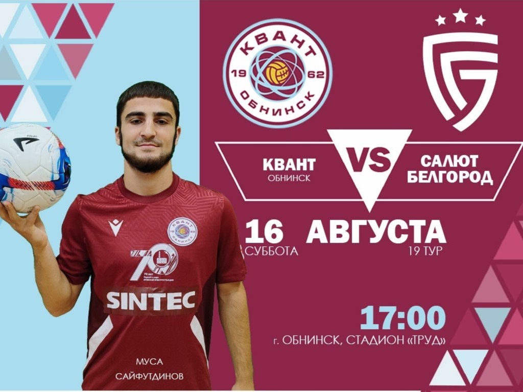 ⚽16 августа в 17:00 на стадионе «Труд» в Обнинске состоится футбольный матч. «Квант» принимает на домашнем поле команду «Салют» из Белгорода. Вход свободный. 👍 Подписаться | Ваша реклама