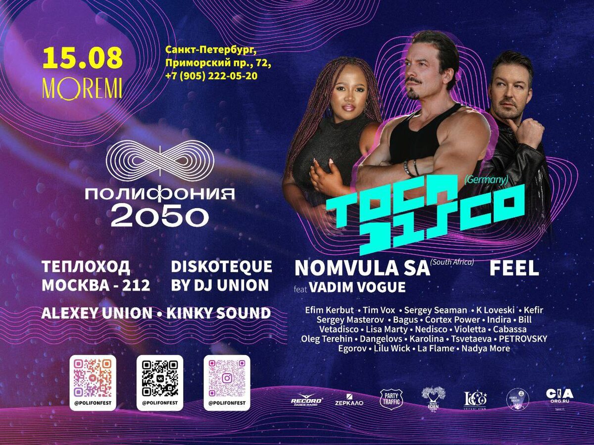 Фестиваль "Полифония 2050" by Zerkalo Event, radio Record & many more. 15 августа СПб Tocadisco (🇩🇪), Alexey Union, Nomvula Sa (🇿🇦), dj Feel, Kinky Sound, K Loveski, Sergey Masterov, Efim Kerbut, Kefir, Bagus, Sergey Seaman, 30 артистов, 5 танцполов. Старт в 18.00 и до утра Клуб Moremi Hall (СПб) 🎫 билеты на фестиваль VIP танцпол by dj Union на теплоходе «Москва 212» путешествие с видом на развод мостов, посадка Дворцовая набережная 18 (СПб) в 22.00 🎫 билеты на корабль