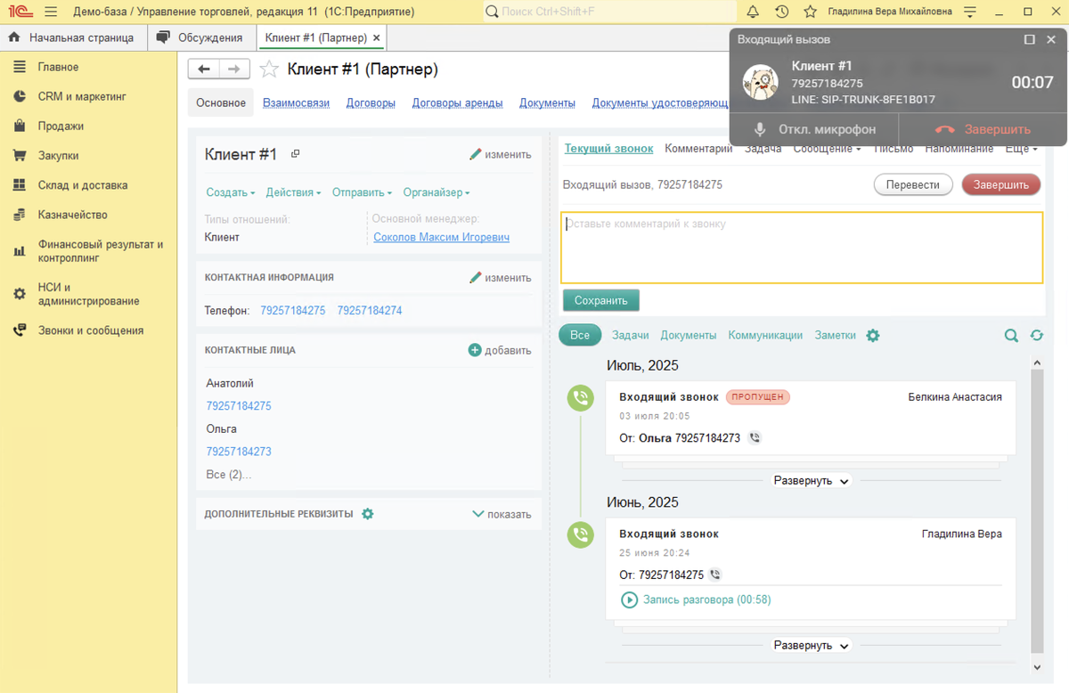- При входящем звонке от клиента, номер которого уже есть в базе, в баннере звонка отображается название организации. После ответа на звонок в 1С:Управление торговлей 11 автоматически открывается карточка клиента с историей всех взаимодействий (звонки, заказы, письма).
