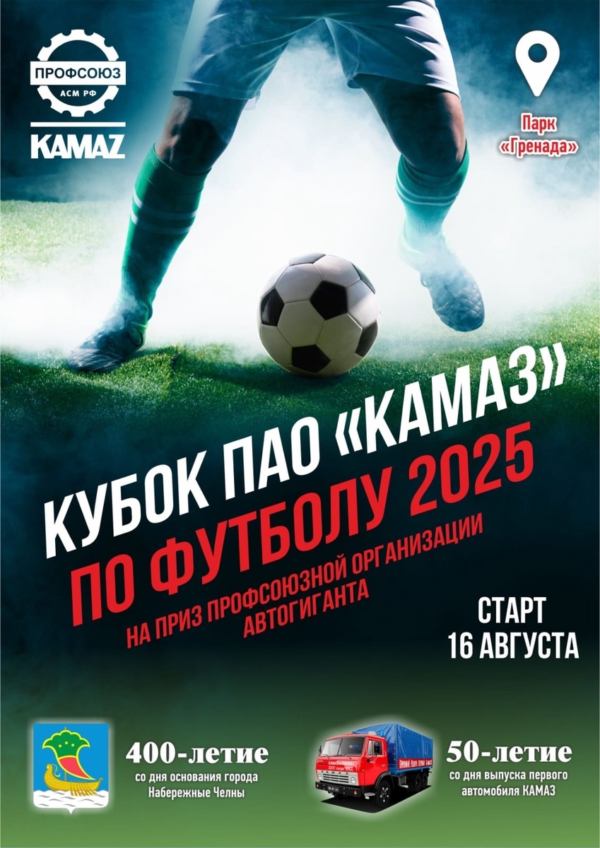 19:00— команды АВЗ - Победитель пары ЛЗ/Ремдизель Матчи пройдут на поле №2 в парке «Гренада». Футбол — это не просто спорт, это азарт, командный дух и яркие эмоции! Приходите поддержать любимые команды, создадим вместе настоящую атмосферу праздника! Кубок ПАО "КАМАЗ" по футболу,организованный профсоюзной организацией автогиганта,посвящен 50-летию выпуска первого автомобиля КАМАЗ и 400-летию со дня основания Набережных Челнов.