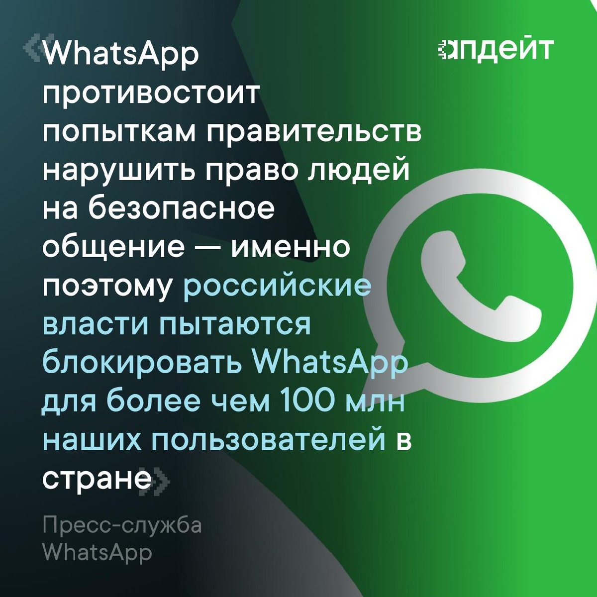 В ответ на пост 💬WhatsApp* ответил Представители WhatsApp* прокомментировали блокировку звонков по WhatsApp* на территории РФ. В компании считают, что правительство России специально блокирует безопасное общение для более 100 миллионов людей по стране, так как властям не нравится, что у людей есть право на безопасное общение. *принадлежит компании Meta, которая признана экстремистской в РФ и запрещена ⚡️ Подписаться.