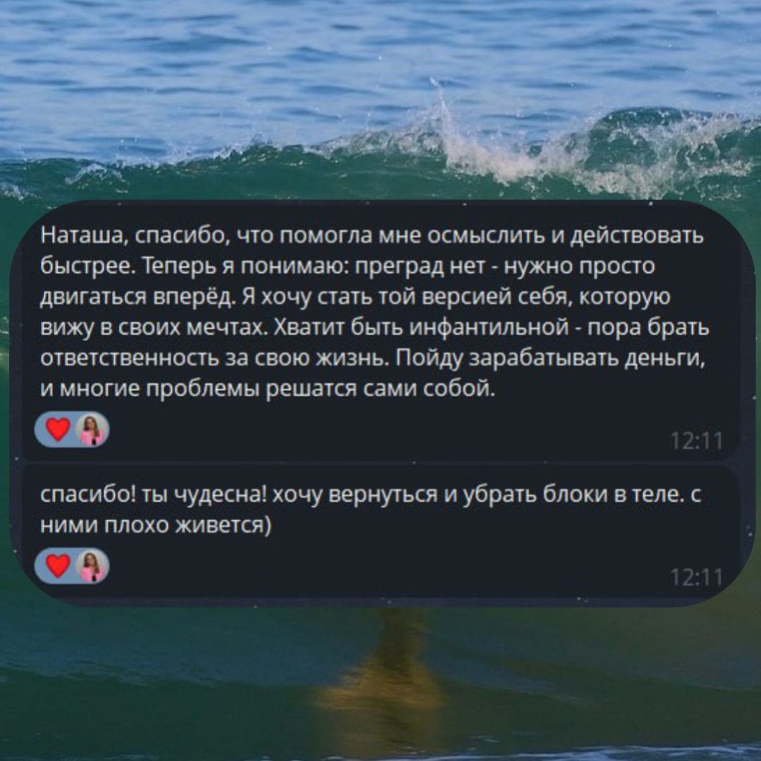 "В моей жизни наступил момент, когда я поняла, что боль от расставания — это не приговор. Я решила записаться на беседу и окунуться в процесс познания себя. Благодаря рекомендациям, четкому плану и поддержке, я снова начала любить себя и поняла, что мои отношения с миром зависят только от меня. Я уверенно иду к своему счастью. Я уже чувствую, как озорная девчонка рвется наружи. Я хочу жить и выбираю себя и счастье."