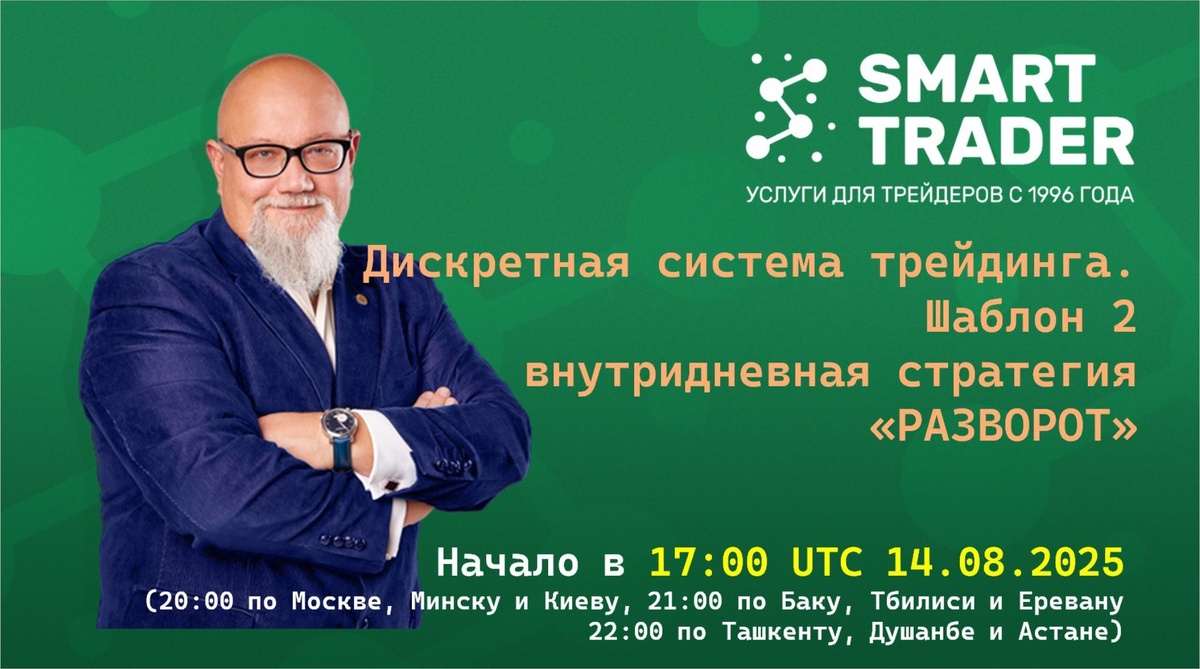 Добрый вечер, уважаемые коллеги! 🌟 Время для нашей традиционной встречи настало — сегодня погружаемся в мир дискретного трейдинга. На этом вебинаре я представлю вторую внутридневную торговую стратегию "РАЗВОРОТ", входящую в мою систему торговли. ⏰ Время старта: 17:00 UTC *Помните: двери нашей виртуальной аудитории открыты — заходите в любой момент, пока идёт эфир!* Почему стоит быть с нами в прямом эфире? Это ваш шанс получить персональные ответы на горящие вопросы, попросить разобрать именно те рыночные ситуации, которые вас волнуют, и получить свежий взгляд на техническую картину интересующих активов. Живое общение — это всегда больше инсайтов и неожиданных открытий! Не успеваете присоединиться? Не беда! Запись появится сначала на нашем YouTube-канале, а затем распространится по другим платформам. 🚀 Небольшая просьба от сердца: ваши лайки, реакции и особенно комментарии — это не просто цифры, а живая обратная связь, которая помогает делать контент ещё лучше и актуальнее дл