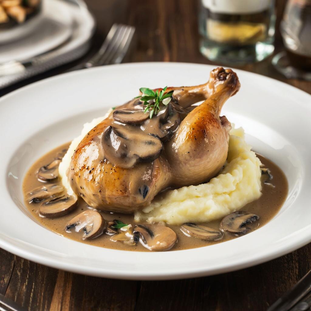 Грудка в сливочном соусе с грибами и пюре