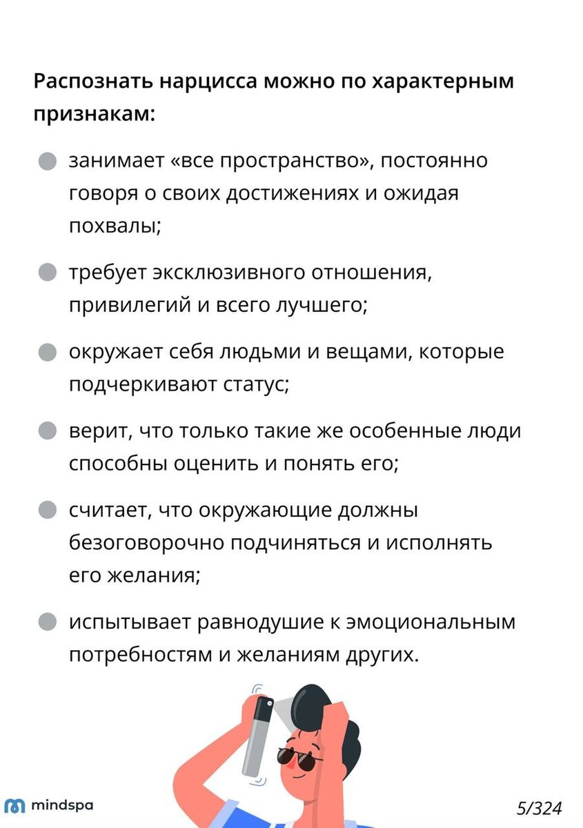 🎁 Лови 1 из 324 страниц гайда «Нарцисс: как общаться, строить отношения и не сойти с ума» А если хочешь, чтобы инструкция по общению с нарциссом всегда была у тебя под рукой 👉 ЗАБИРАЙ НАШ ТОПОВЫЙ ГАЙД ЦЕЛИКОМ Он реально заменяет 20 книг о нарциссах: с ним ты научишься их распознавать, отстаивать свои границы и мягко выходить из отношений, если ситуация совсем запущена.
