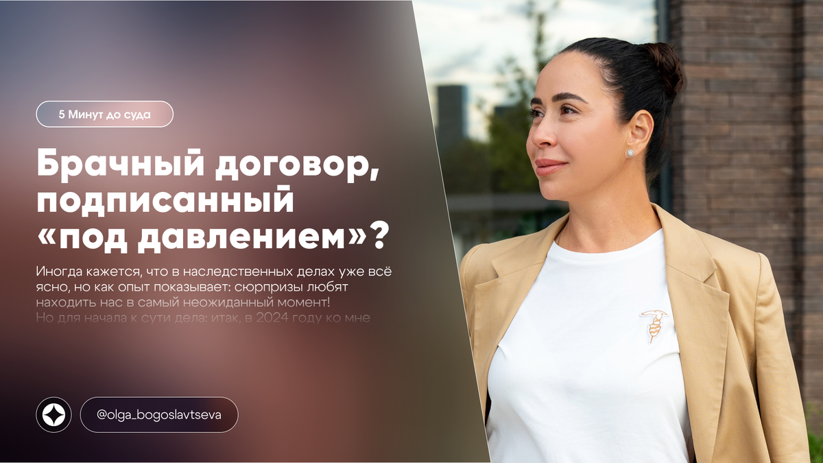 Как ни забавно, но самым популярным вопросом у моих товарищей, кто не является частью мира юриспруденции, является именно вопрос подписания документов под давлением. Сегодня разберем показательную ситуацию из разряда подобных стечений обстоятельств! Читаем, друзья! Муж перед свадьбой настоял на брачном договоре, где всё имущество в случае развода остаётся ему. Жена подписала, ведь иначе бы брак не состоялся. Но как-то не сошлось, и через два года развод и вопрос: можно ли оспорить? По ст. 44 Семейного кодекса РФ брачный договор может быть признан недействительным, если он заключён под влиянием обмана, угроз, насилия или стечения тяжёлых обстоятельств. Давление может быть не только физическим, но и психологическим — это подтверждается перепиской, свидетельскими показаниями, аудио- и видеозаписями. Если договор ставит одного из супругов в крайне неблагоприятное положение (например, полностью лишает его имущества), суд вправе признать такие условия недействительными по ст. 42 СК РФ и ст.