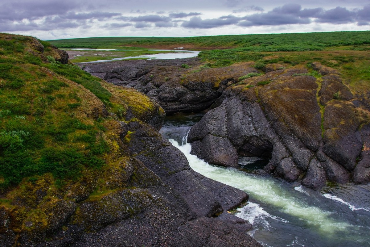 Река Хальмеръю и водопад, вдалеке виден Полярный Урал. Фото с выезда Неизвестной России в Воркуту
