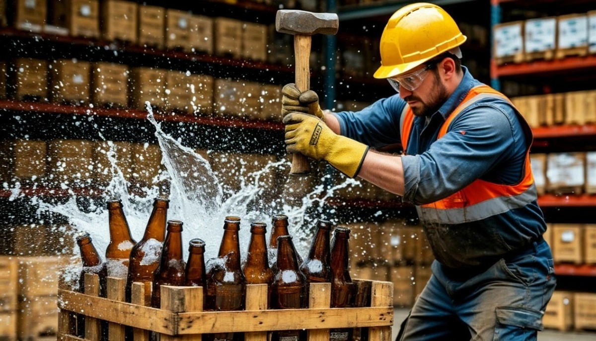 Перебазировались в цех розлива. Прохладнее (+35 вместо +42 – курорт!), есть вода, туалет, вытяжка от паров. И главное – пол со стоками в канализацию! Технология: кладешь бутылки или банки на паллету и... ДОЛБИШЬ МОЛОТКОМ СО ВСЕХ СИЛ! 💥 Пиво – в дырку, осколки – потом лопатой в короб! Артур: "Ферштейн?" Мы: "Арбайтен!" 😁