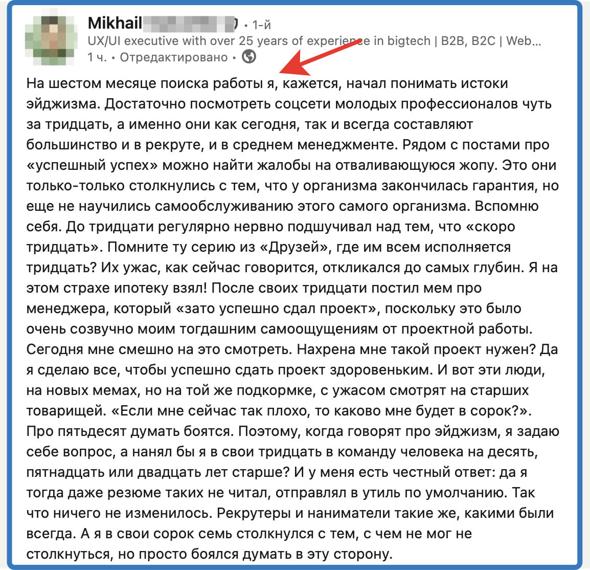 На 100% согласен про эйджизм в ИТ. Собственно причина не брать возрастных очень простая и банальная - они не будут так упираться в достижении целей, как более молодые ребята... Остальное это просто лирика. Любой бизнес хочет на заданные деньги взять более эффективного - энергичного - быстрого и т.п. сотрудника. А возрастной, тянет на опыте, но не тянет на энергии :) на длительном забеге, коим бизнес и является. Да на картинке почитайте, верно пишет чел. И к сожалению ничего с этим не поделать. Русский ИТ бизнес