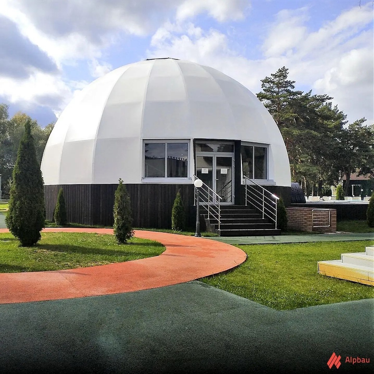 🌳 Как выглядит купол из дерева от Alpbau спустя 4 года эксплуатации? В апреле 2021 года на территории парк-отеля Sosnovoe в Самаре мы установили всесезонный купол из дерева, где был размещён полноценный SPA-комплекс с финской сауной, хамамом, гидромассажем и массажными кабинетами. С первого дня комплекс стал самым популярным местом отдыха гостей курорта. Многие посетители отмечают дизайн конструкции: купольная форма и натуральное дерево создают уютное и современное пространство. Покрытие сферы не только защищает от осадков, но и повышает прочность конструкции. ❄️ Купол активно используется и зимой: от холодов надежно защищают утепленный тент с двойным слоем ПВХ-мембраны и 100 мм холлофайбера. Регулярные проверки показывают, что даже после 4 лет активного использования конструкция находится в том же состоянии, что и в день сдачи объекта. Этот пример демонстрирует, что конструкции Alpbau сохраняют первоначальный вид и функциональность даже при интенсивной эксплуатации. Если вас