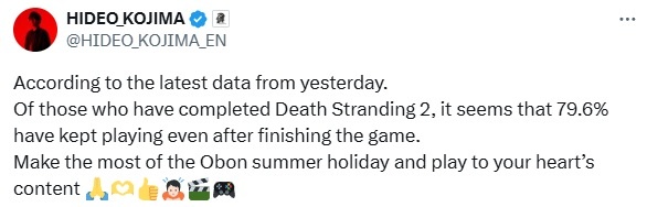 Хидео Кодзима продолжает отслеживать статистику Death Stranding 2. На этот раз он сообщил, что процент игроков, продолжающих исследовать мир после завершения основного сюжета, вырос с 79.5% до 79.6%. Заодно гений призвал фанатов "максимально использовать летние каникулы Обон и играть в свое удовольствие," имея в виду японский фестиваль Обон – один из главных праздничных сезонов в Японии. Любопытно, что это сообщение было опубликовано в англоязычном Twitter-аккаунте Кодзимы, поэтому неясно, насколько упоминание японского праздника найдет отклик у глобальной аудитории Death Stranding 2. Конечно, нет ничего удивительного в том, что создатель игры хочет, чтобы геймеры продолжали изучать созданный им мир. Но настойчивость Кодзимы в отслеживании этой цифры и его одержимость именно этой статистикой вызывает особый интерес. Всего неделю назад Кодзима сообщал о постепенном росте числа игроков, которые продолжают запускать Death Stranding 2 после прохождения основного сюжета. Очевидно, это много