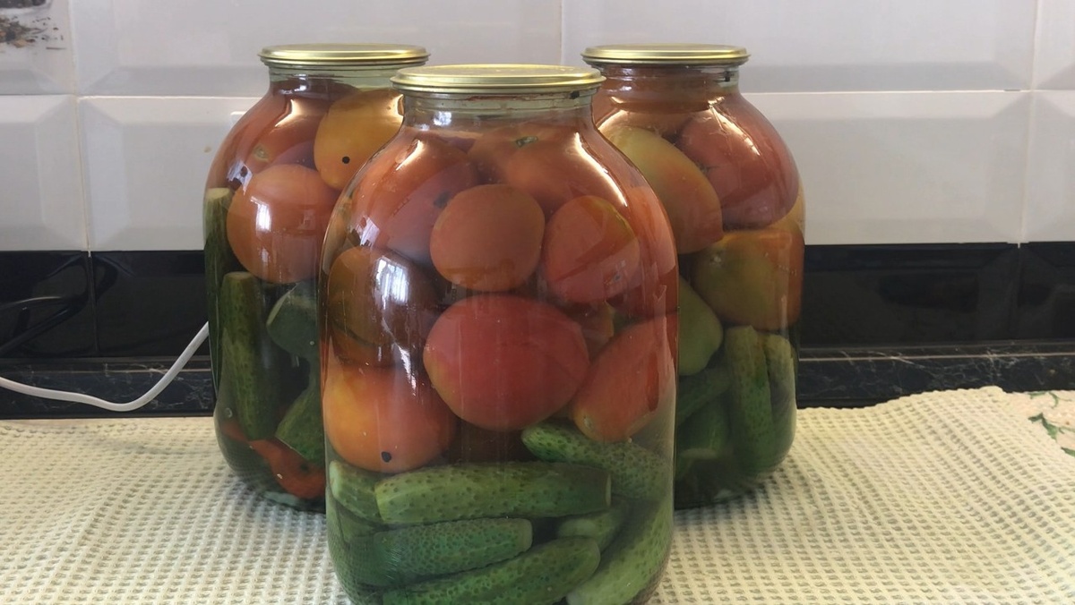 Этот рецепт порадует насыщенным вкусом. Корень хрена добавит крепости, а красный перец — лёгкую остроту. В результате получится умеренно острое и бодрящее блюдо. **Ингредиенты:** - Вода — 1 литр; - Соль — 2 ст. ложки; - Сахар — 5 ст. ложек; - Уксус 9% — 4 ст. ложки; **Приправы:** - Укроп (зонтик) — 1 шт.; - Корень хрена — по вкусу; - Зёрна горчицы — 0,5 ч. ложки; - Чёрный перец горошком — 10–15 шт.; - Лавровый лист — 1 шт.; - Чеснок — 2 зубчика; - Болгарский перец — по желанию; - Острый перец — по вкусу. Тщательно мою огурцы, помидоры и зелень. На дно банки кладу специи: корень хрена нарезаю кружочками, чеснок — лепестками. Использую стебли укропа, так как они более ароматные, и добавляю остальные специи. Далее кладу огурцы, затем помидоры. Чтобы они не лопнули при заливке горячего маринада, каждый помидор прокалываю зубочисткой. Баночки готовы. Теперь нужно приготовить маринад. Поставьте кастрюлю на плиту и доведите жидкость до кипения. Разлейте горячий маринад по банкам, дайте остыть