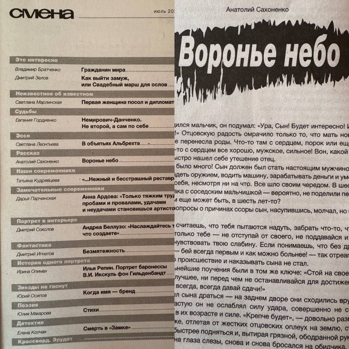 Сам себя не похвалишь 2...😏 Журнал "Смена", июльский номер, мой – позволю себе так выразиться – первенец. Рассказ "Воронье Небо", про отца, сына и, наверное, любовь! Читать на Пресса.ру – https://pressa.ru/ru/reader/#/magazines/smena/issues/07-2025/pages/28/ АвторТудей – https://author.today/reader/335210 Всем спасибо и удачи!