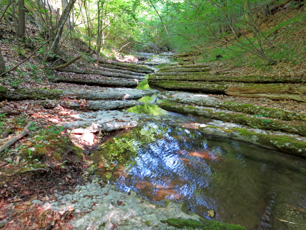 И снова скальные слои, промытые водой. Но! Они промыты углом и совсем наоборот! Здесь вода не падает со ступенек! Ей надо подниматься на каждую! Я такое вижу впервые. Вот фото и вода течет не на меня, а от меня! Удивительно! На видео будет видно лучше. И красиво! Попался уставший камень. Надоело ему висеть! Сделал себе кругленькую опору. И снова дальше по руслу. Склоны сходятся. А мы между ними идет по каменной мостовой. На пути попалось еще одно удивительное место. В русле вымыты огромные ванночки! Вроде бы и камень везде одинаков. Почему так? Миша снял рюкзак и решил посмотреть что там дальше, за поворотом. А я осталась побродить. Это место такое узкое, что деревья с противоположных склонов сходятся над головой. Как то неуютно здесь одной. Миша! Ты где? Дальше решили не ходить. Пошли обратно, к тому месту, где река сделала водопады наоборот. Там и устроились на привал. Немного отдохнули и в обратный путь. То отражения все останавливают меня. То окаменелости выглядывают. Как тут