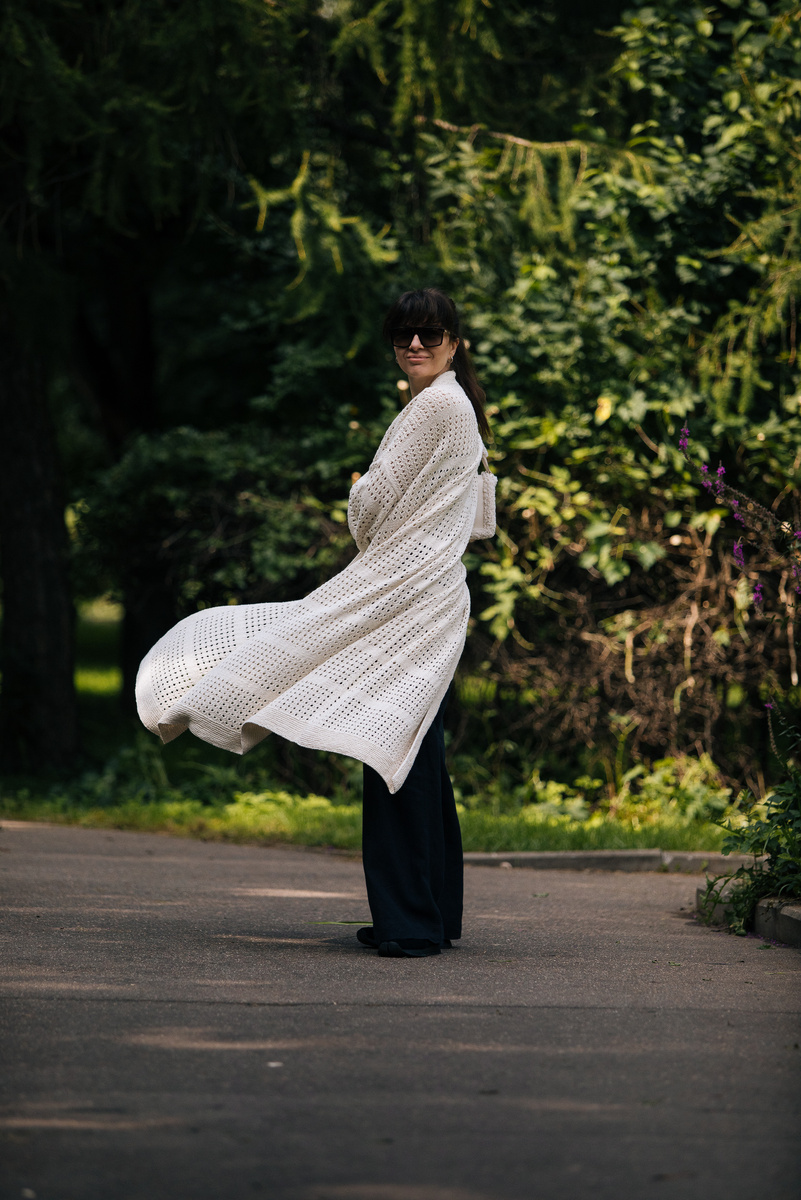 Пальто я не ношу. В смысле вязаные пальто. За всю мою вязальную жизнь (а это 36 лет) я связала 3 пальто и ни одно не надела более пары раз - в московском климате просто некогда: или еще слишком тепло, или уже слишком холодно и продувается даже на подкладке. Поэтому эту тему я закрыла. Ну и смотрится, на мой взгляд, гораздо менее выигрышно чем классическое шерстяное пальто из ткани. Когда я начала вязать этот шелк, то первая мысль была о длинной вещи. Это же летняя вещь, которая не должна греть, не должна защищать от ветра. Она должна быть просто красивой. Для меня это значит - простой. В исходнике она тоже простая, но это не мой вариант дизайна. Драмы маловато 😂 Я начала вязать со спинки. Вязала снизу вверх, а вот рисунок распределяла сверху вниз в расчете, чтоб красиво ложилась линия плеч и пройма. Спинку я стирала отдельно, чтобы оценить вытяжение полноформатного полотна (но оно оказалось стабильно на все 100%) А раз стабильно - значит ничего пересчитывать не надо и можно вязать