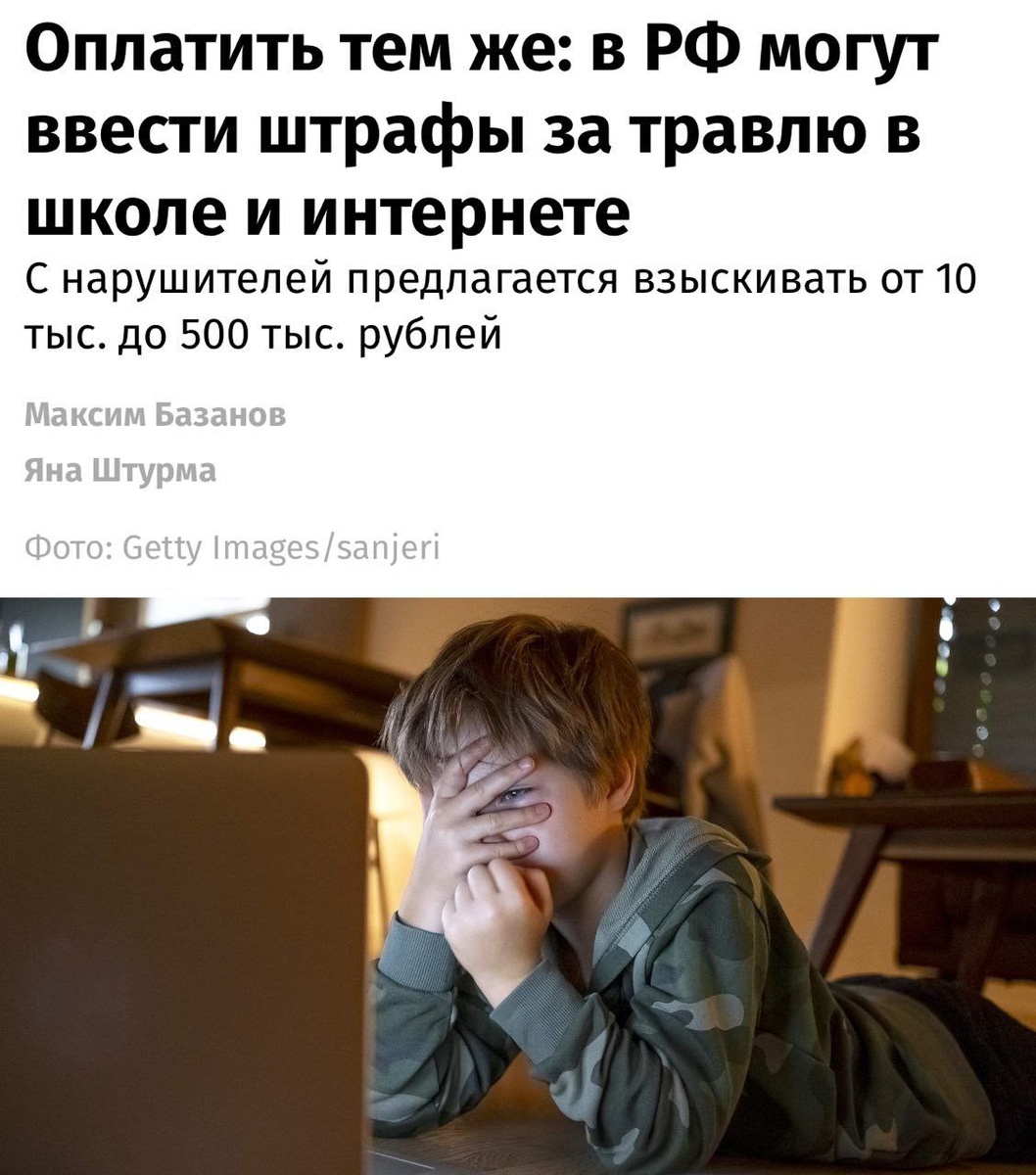 В России могут ввести штрафы за травлю в интернете и школе. Законопроект внесут на рассмотрение в Госдуму от ЛДПР. Документ определяет буллинг как «систематическое унижение чести и достоинства другого лица», включая публичную дискредитацию в интернете. Если обидчиком окажется подросток младше 16 лет, ответственность ляжет на его родителей или опекунов. Причем инициатива направлена и на взрослых, которые могут столкнуться с травлей на работе. Для физлиц предусмотрены штрафы до 50 тысяч рублей, для юрлиц — до 500 тысяч рублей.