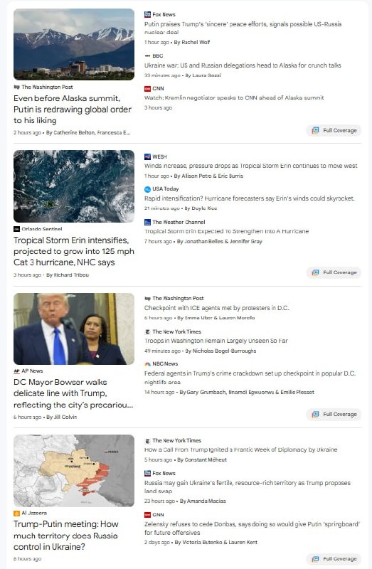 Новостная повестка в США перед переговорами В топе новостей в США — предстоящий саммит на Аляске, прогноз усиления тропического шторма «Эрин» до урагана третьей категории, протесты и акции в Вашингтоне, заявления мэров крупных городов на фоне политического противостояния с Трампом, публикации о снижении потребления алкоголя в стране, громкие уголовные процессы и экзотичные истории. Это говорит о том, что американская медиаповестка в преддверии встречи на Аляске размыта и перегружена внутренними темами.