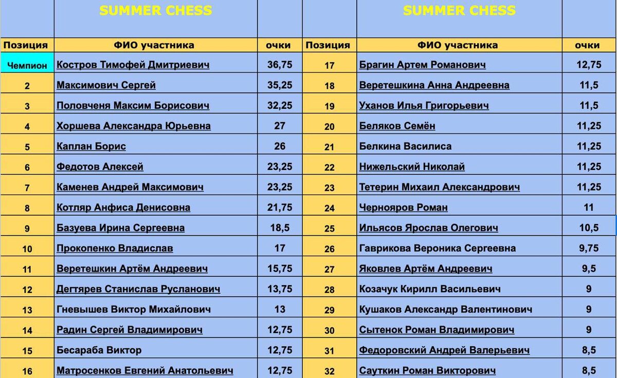 🔥Актуальная таблица «SummerChess»🔥